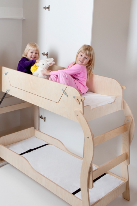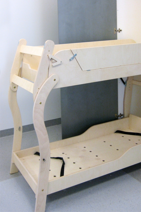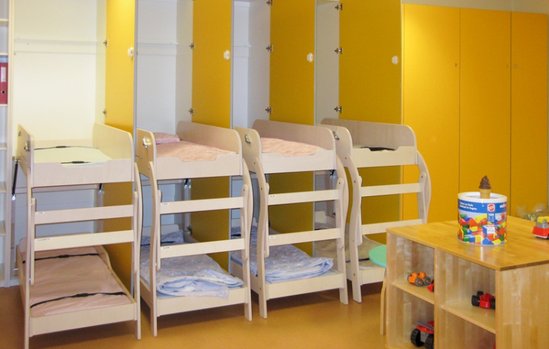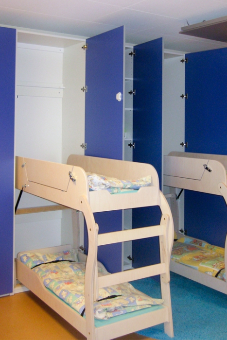Janella-kaappisängyn yksityiskohdat on suunniteltu yhteistyössä päiväkotihenkilöstön kanssa. Kiinnitimme erityistä huomiota turvallisuuteen, kuitenkaan työergonomiaa tai käytännöllisyyttä unohtamatta. Valmistamissamme kaappisängyissä on aina korkeat turvallisuusvaatimukset täyttävät turvalaidat yläsängyssä, alasängyn kiinteät vierähtämissuojat vakiona, turvalukitus, kolkutinesto sekä sängyn päätyyn turvalaidaksi käännettävät kaksiaskelmaiset tikkaat. Vakiomallissamme käytännöllisyyttä ja turvallisuutta on lisätty yläsängyn toiseen laitaan sijoitetulla vuodevaatteiden sijaamista ja lapsen hoitoa helpottavalla alaslaskettavalla saranoidulla osalla.